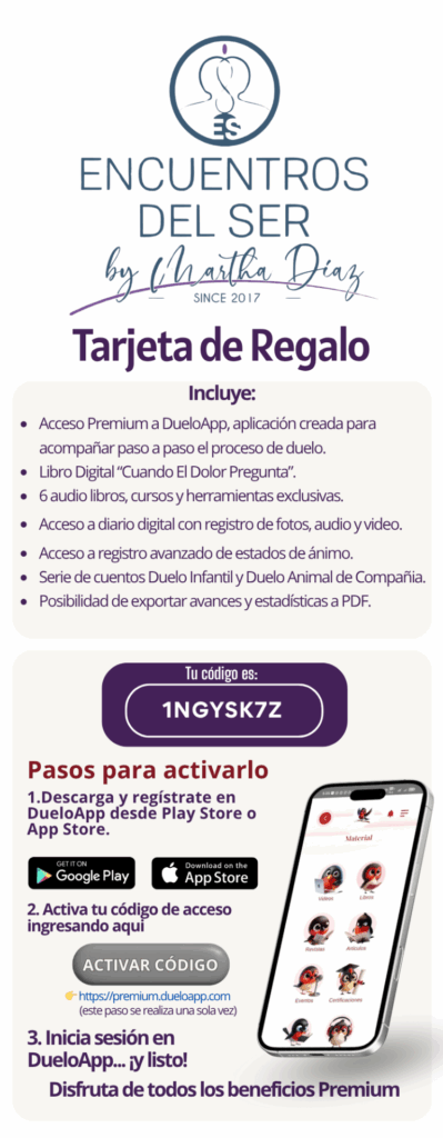 Desde Estados Unidos, la Organización Encuentros del Ser, liderada por Martha Díaz, decidió integrar DueloApp en sus procesos. Lo hizo personalizando sus Tarjetas de Manejo del Duelo con su propio logo, brindando a las personas un recurso emocional potente, diseñado con sensibilidad y coherencia profesional.